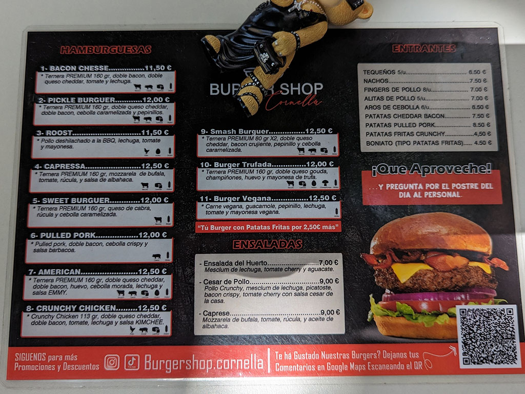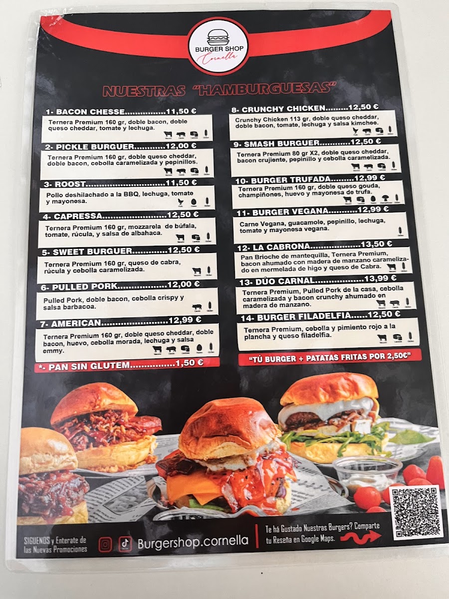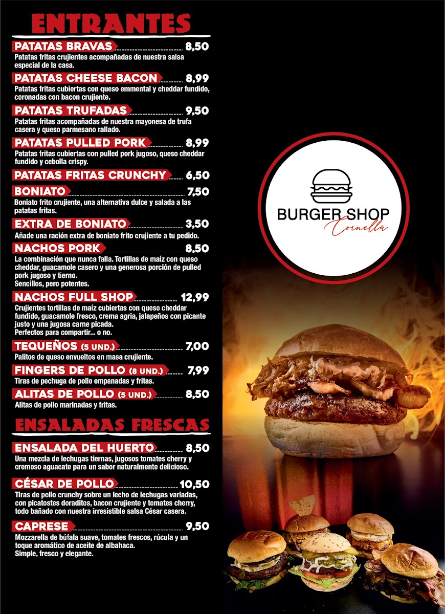 Introducing the menu at Burger Shop Cornellà, where culinary passion meets vibrant flavors. Located in the heart of Cornellà de Llobregat, this hamburger haven is a must-visit for burger enthusiasts. Their standout offerings include the Premium Beef Capresse Burger, featuring creamy buffalo mozzarella and fresh arugula—priced at €14.50. For chicken lovers, the Pulled Chicken Roost Burger paired with BBQ sauce and a fluffy brioche bun at €13.50 tantalizes the taste buds. Vegans are not left out, as the Vegan Patty Burger presents an exquisite blend of guacamole and crisp veggies at the same price. Don't skip the appetizers; the Crispy Pork Nachos and Onion Rings set the stage for an unforgettable meal. Dine in their inviting terrace, and let the delightful aromas and hearty flavors sweep you away on a culinary journey like no other—one that will surely beckon you back for more!